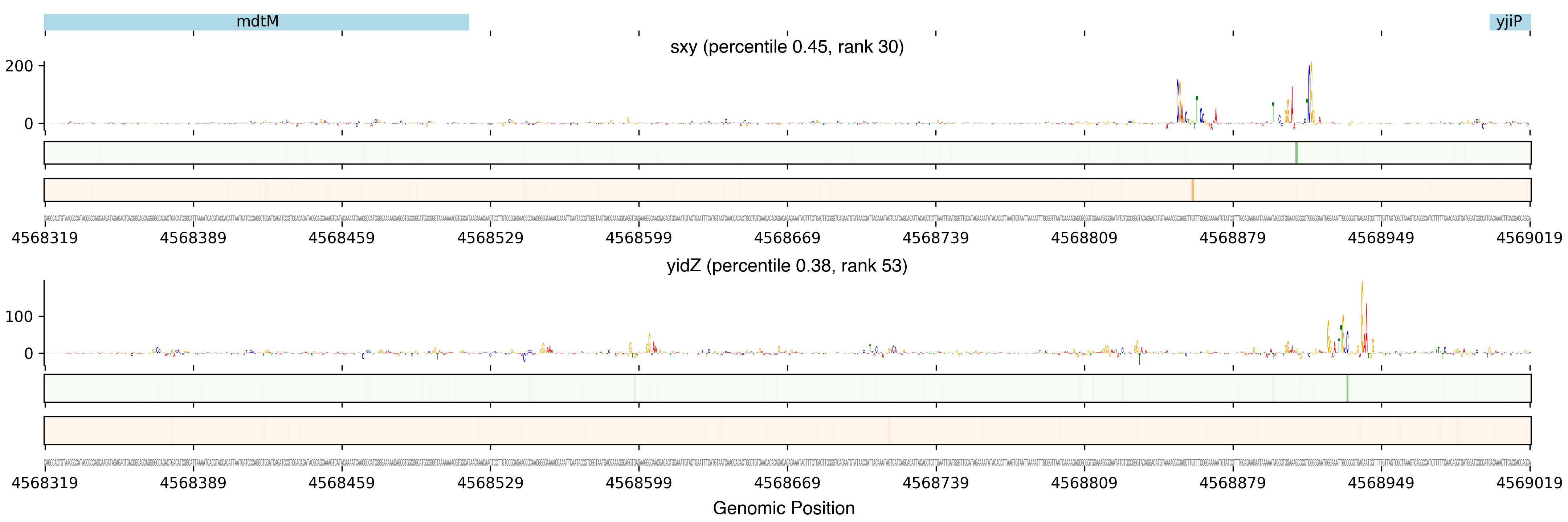 Top row shows gene annotations. Each set of panels beneath the annotation row shows the predictions for one TF. The sequence logo shows the contribution of the base at each position to the overall binding affinity, with bases above the horizontal axis contributing positive binding affinity and bases below contributing negative binding affinity. The heatmaps below the sequence logos show the exponentiated binding score at each position (the exponentiated score of the weight matrix and bias at that position). The top heatmap in green shows hits on the positive strand, and the bottom heatmap in red shows hits on the negative strand.