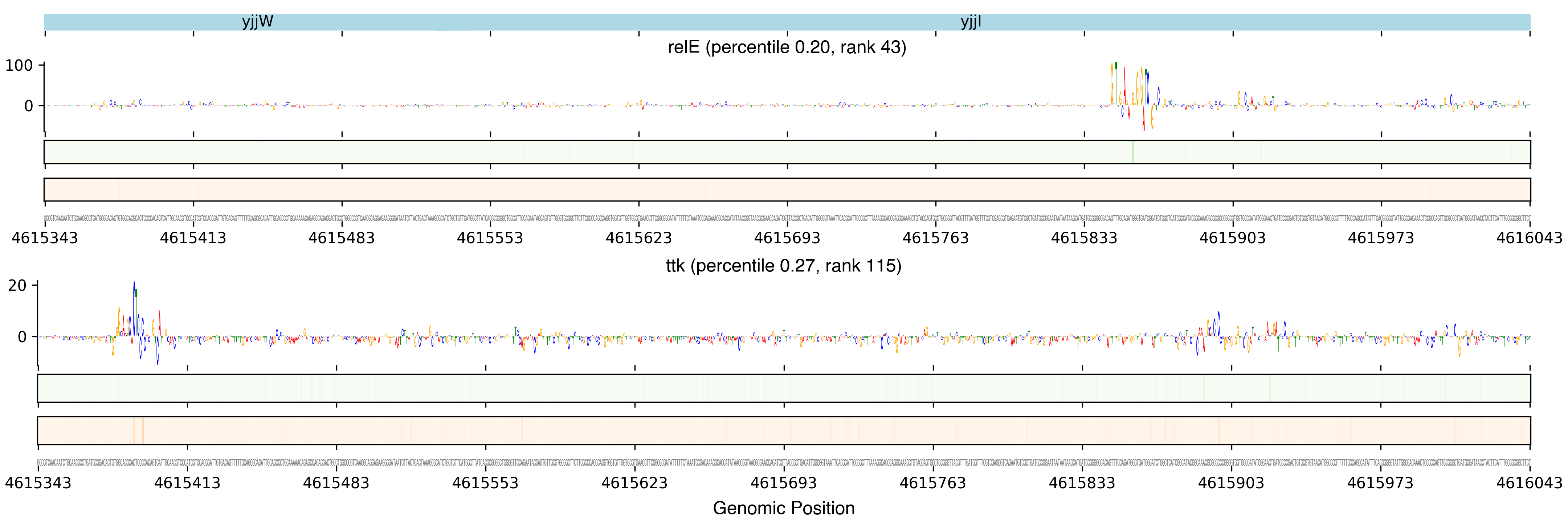 Top row shows gene annotations. Each set of panels beneath the annotation row shows the predictions for one TF. The sequence logo shows the contribution of the base at each position to the overall binding affinity, with bases above the horizontal axis contributing positive binding affinity and bases below contributing negative binding affinity. The heatmaps below the sequence logos show the exponentiated binding score at each position (the exponentiated score of the weight matrix and bias at that position). The top heatmap in green shows hits on the positive strand, and the bottom heatmap in red shows hits on the negative strand.