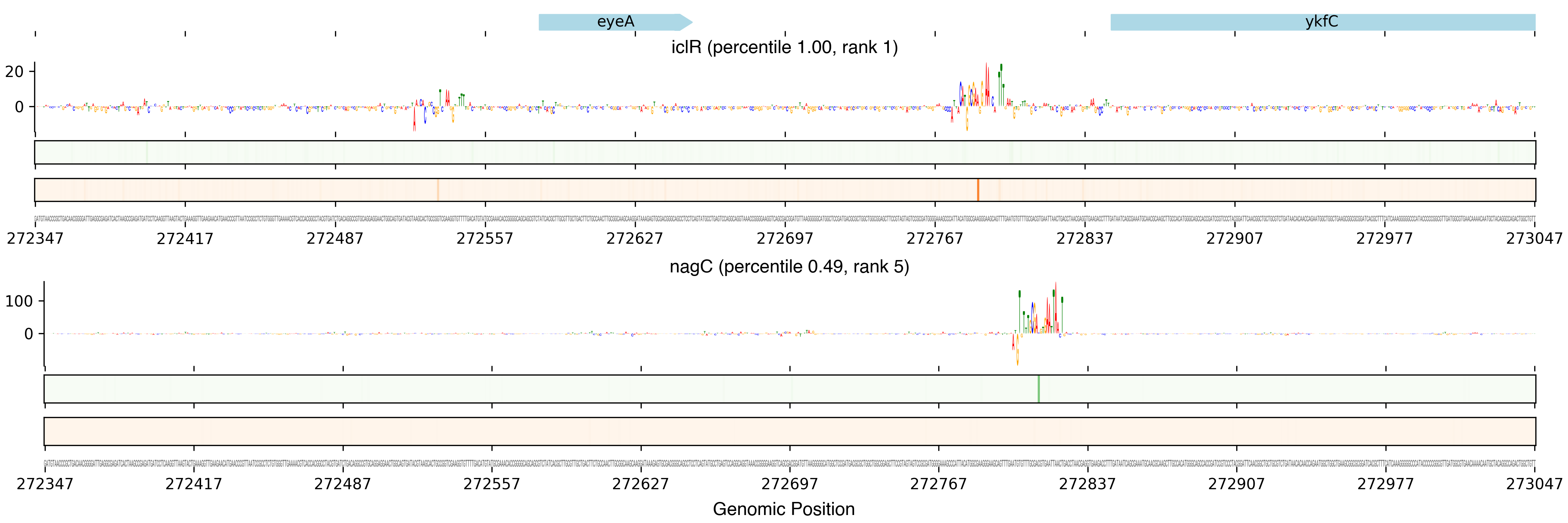 Top row shows gene annotations. Each set of panels beneath the annotation row shows the predictions for one TF. The sequence logo shows the contribution of the base at each position to the overall binding affinity, with bases above the horizontal axis contributing positive binding affinity and bases below contributing negative binding affinity. The heatmaps below the sequence logos show the exponentiated binding score at each position (the exponentiated score of the weight matrix and bias at that position). The top heatmap in green shows hits on the positive strand, and the bottom heatmap in red shows hits on the negative strand.