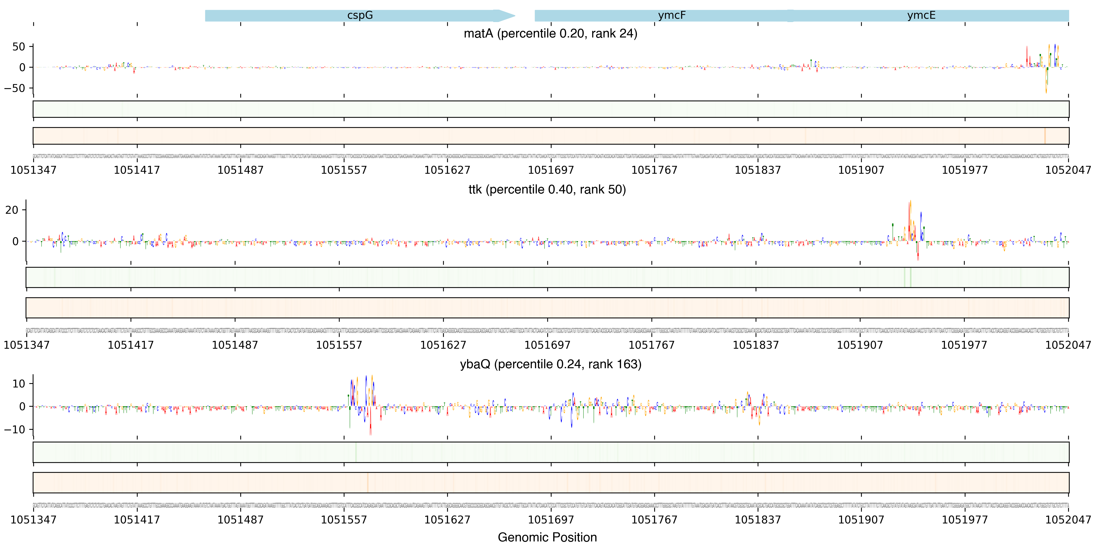 Top row shows gene annotations. Each set of panels beneath the annotation row shows the predictions for one TF. The sequence logo shows the contribution of the base at each position to the overall binding affinity, with bases above the horizontal axis contributing positive binding affinity and bases below contributing negative binding affinity. The heatmaps below the sequence logos show the exponentiated binding score at each position (the exponentiated score of the weight matrix and bias at that position). The top heatmap in green shows hits on the positive strand, and the bottom heatmap in red shows hits on the negative strand.