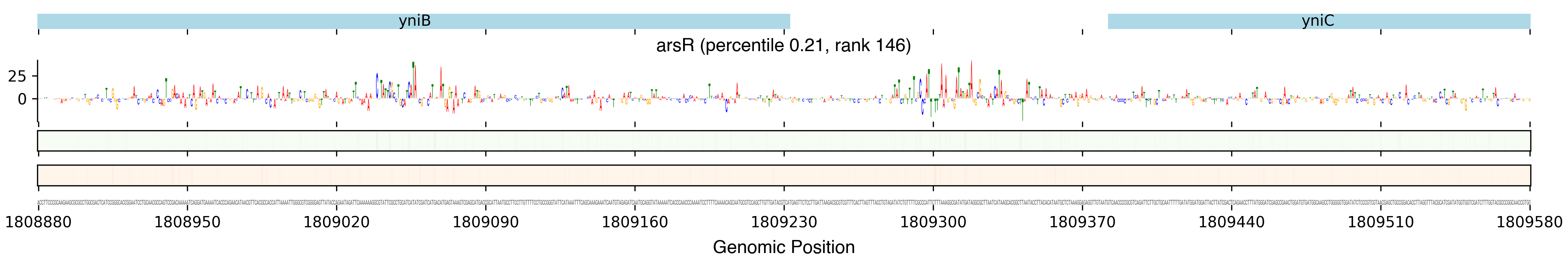 Top row shows gene annotations. Each set of panels beneath the annotation row shows the predictions for one TF. The sequence logo shows the contribution of the base at each position to the overall binding affinity, with bases above the horizontal axis contributing positive binding affinity and bases below contributing negative binding affinity. The heatmaps below the sequence logos show the exponentiated binding score at each position (the exponentiated score of the weight matrix and bias at that position). The top heatmap in green shows hits on the positive strand, and the bottom heatmap in red shows hits on the negative strand.