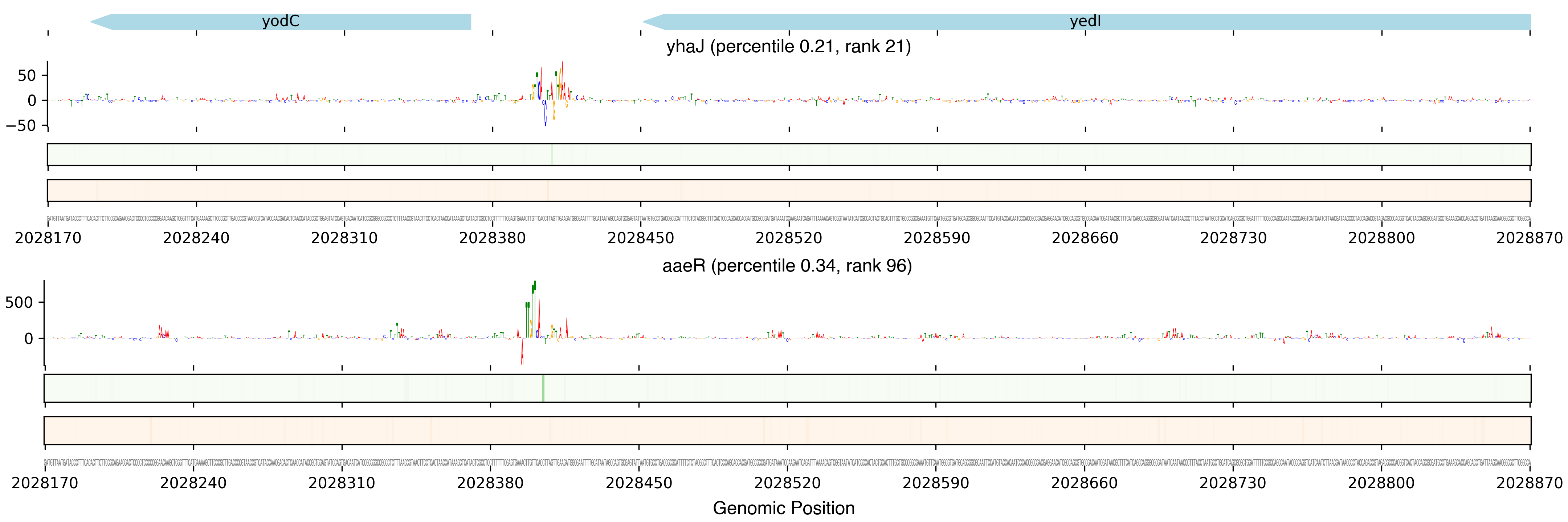 Top row shows gene annotations. Each set of panels beneath the annotation row shows the predictions for one TF. The sequence logo shows the contribution of the base at each position to the overall binding affinity, with bases above the horizontal axis contributing positive binding affinity and bases below contributing negative binding affinity. The heatmaps below the sequence logos show the exponentiated binding score at each position (the exponentiated score of the weight matrix and bias at that position). The top heatmap in green shows hits on the positive strand, and the bottom heatmap in red shows hits on the negative strand.