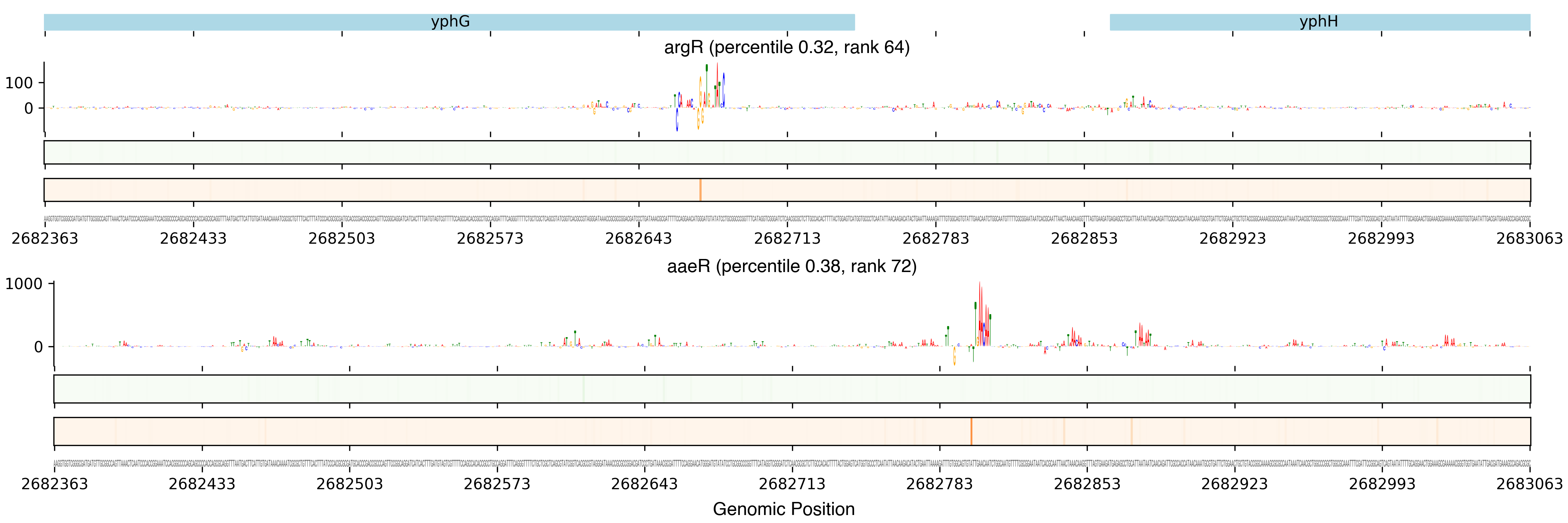 Top row shows gene annotations. Each set of panels beneath the annotation row shows the predictions for one TF. The sequence logo shows the contribution of the base at each position to the overall binding affinity, with bases above the horizontal axis contributing positive binding affinity and bases below contributing negative binding affinity. The heatmaps below the sequence logos show the exponentiated binding score at each position (the exponentiated score of the weight matrix and bias at that position). The top heatmap in green shows hits on the positive strand, and the bottom heatmap in red shows hits on the negative strand.