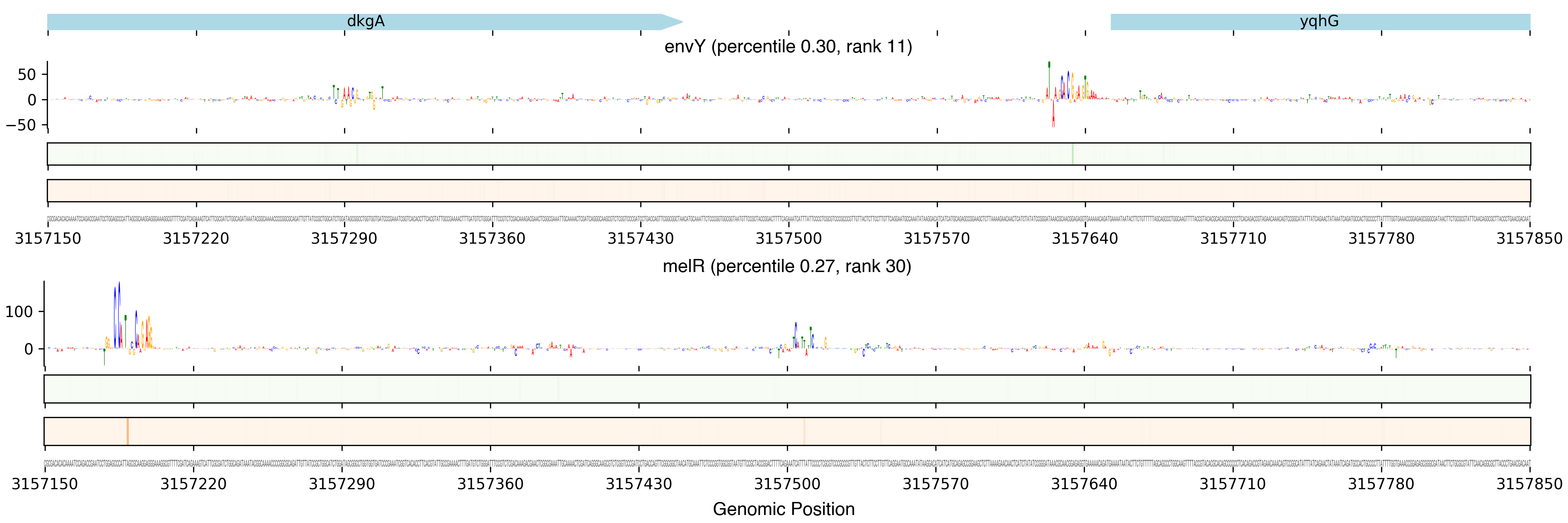 Top row shows gene annotations. Each set of panels beneath the annotation row shows the predictions for one TF. The sequence logo shows the contribution of the base at each position to the overall binding affinity, with bases above the horizontal axis contributing positive binding affinity and bases below contributing negative binding affinity. The heatmaps below the sequence logos show the exponentiated binding score at each position (the exponentiated score of the weight matrix and bias at that position). The top heatmap in green shows hits on the positive strand, and the bottom heatmap in red shows hits on the negative strand.
