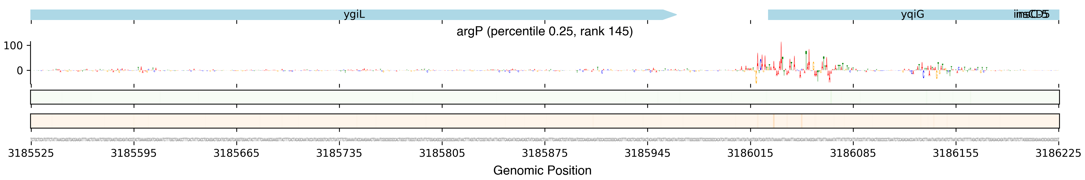Top row shows gene annotations. Each set of panels beneath the annotation row shows the predictions for one TF. The sequence logo shows the contribution of the base at each position to the overall binding affinity, with bases above the horizontal axis contributing positive binding affinity and bases below contributing negative binding affinity. The heatmaps below the sequence logos show the exponentiated binding score at each position (the exponentiated score of the weight matrix and bias at that position). The top heatmap in green shows hits on the positive strand, and the bottom heatmap in red shows hits on the negative strand.